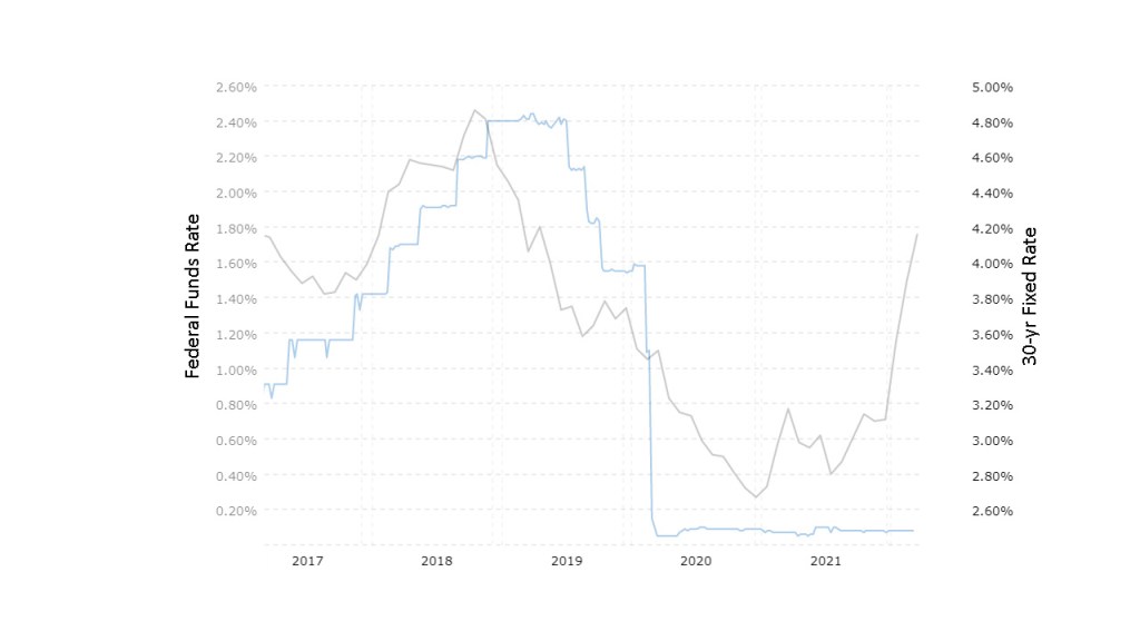 Below is a graph that shows both the Federal Funds rate (the blue line) and 30-yr fixed rate (the gray line) over the last 5 years. You can see there is no direct correlation. Surely, in 2019 they both were generally declining, but not at the same time nor pace.