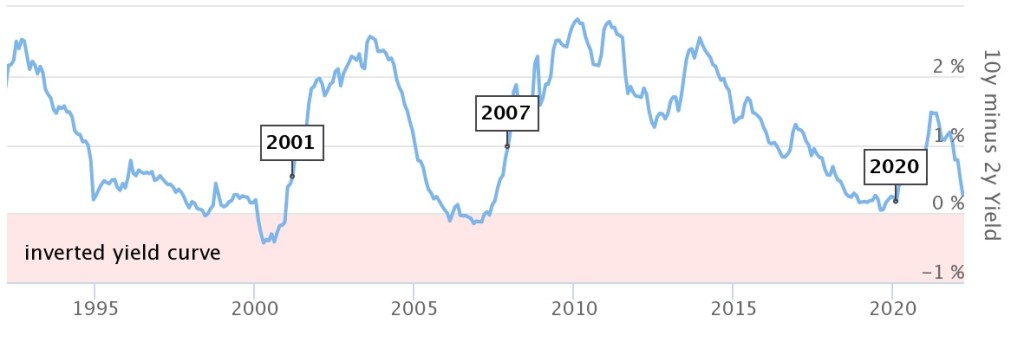 But, I will leave you with one more graph to consider as potentially a glimpse into the future. Below is an illustration that shows the difference in interest rates from long-term to short-term US government bonds. When the short-term bond has a higher rate than a long-term bond (a very unlikely event), the line’s chart goes into the pink negative territory. Economists call that an “inverted yield curve,” and this financial anomaly has taken place before every US economic recession over the last 60 years.