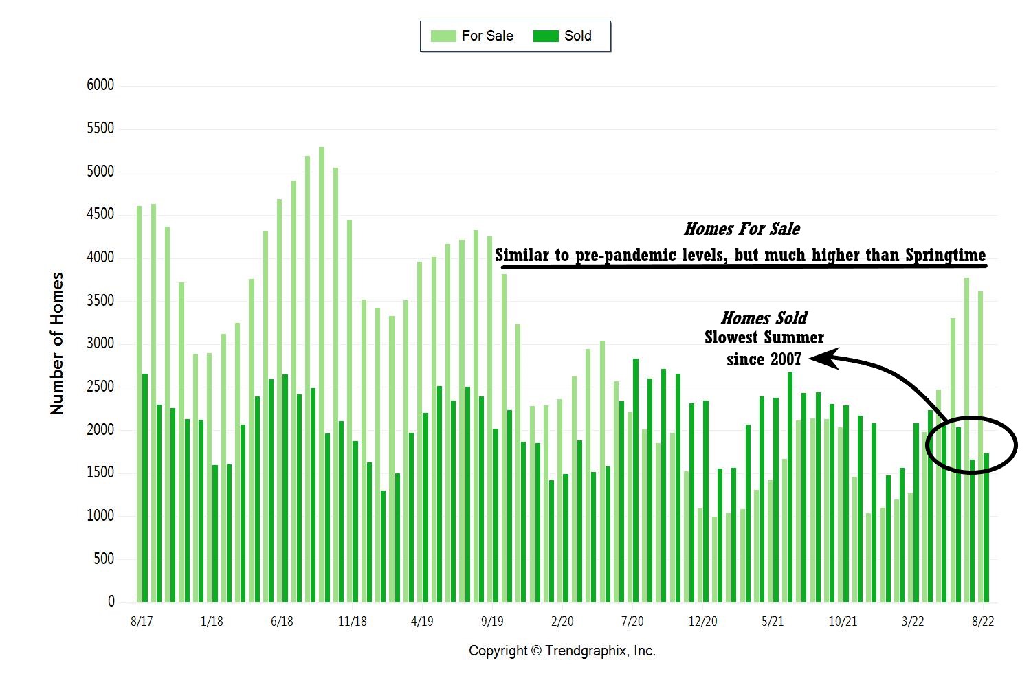 As summer temps were heating up, the pace of home buying was falling dramatically. 30% fewer homes were purchased this June compared to the same time in 2021. Oddly, early summer is normally when we see volume INCREASE as spring-fever purchases begin to close escrow. Clearly the market was going through a change, and this shift continued through the rest of summer. Things appear to have bottomed out, as August saw a small increase compared to July, but we are still at seasonably low levels. You have to go back all the way to 2007 to see a slower summer for Sacramento real estate.