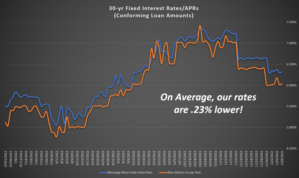 Here is a chart showing how our 30-yr fixed rates* recently compared to the industry at large. The blue line is the Mortgage News Daily Index, a broad sample of rates offered by various mortgage companies, while our available rates are shown on the orange line. You can see our rates have been consistently lower than the industry index, on average, by .23%.